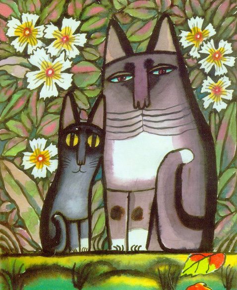А рядом картина с милой кошачьей парой. Здесь карикатурист стремился передать человеческие черты через фигуры четырехлапых. Он элегантный кот в изысканной шляпе с трубкой в зубах. Она – серая скромная кошка с бантиком в точку, которая закрыв глаза тихо мурлычет своему кавалеру какую-то нежную мелодию любви. Чуть дальше картина с парой кошек под кустом роскошных белых цветов. Один кот спокойно важно сидит расслабив каждую шерстинку на своем теле, другой осматривает ситуацию вокруг. Каждая картина интересна по своему и над каждой можно долго размышлять или просто любоваться. У каждого котика свое настроение, своя атмосфера, которая оставляет незабываемые впечатления, а самое главное, что это наш художник, не уступающий манере выполнения другим.