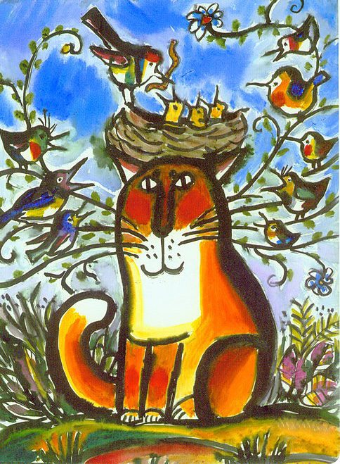 Вот рыжий безразличный кот, он имеет длинные усы-провода на которых сидят напевные птицы. Они поют, бегают возле него, по его голове, а он задумчиво всматривается вдаль своими спокойными, безразличными глазами и даже позволил птицам свить на себе гнездо. Возможно, сейчас он потянется, сладко выгнет спинку и свернувшись клубочком погрузится в мир кошачьих снов, или еще долго будет всматриваться в неизвестное пространство. Спокойная поза кота и воплощение этого лирического настроения очаровывает зрителя и погружает его в мир размышлений и спокойствия.