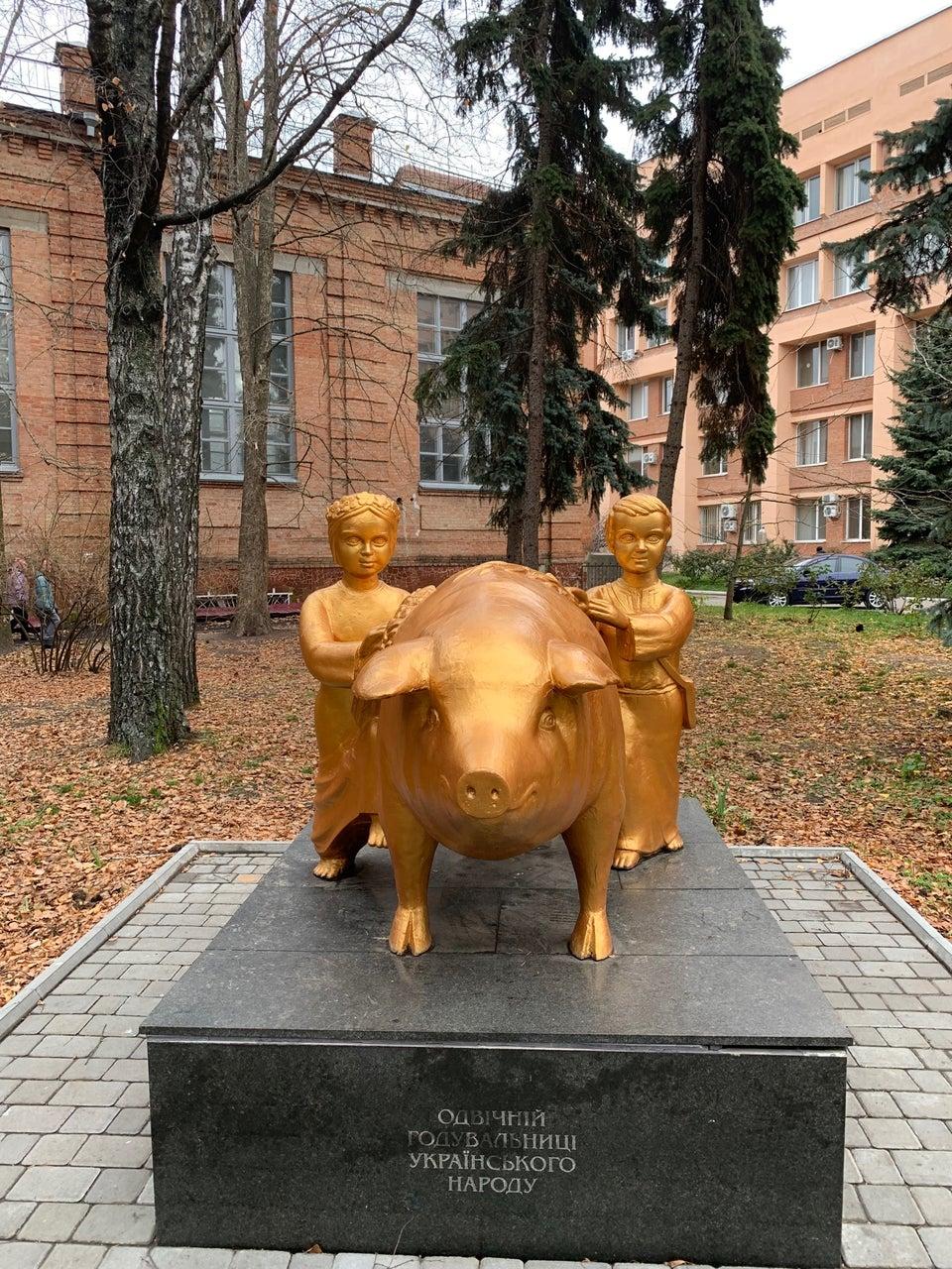 Хорошо подкрепившись, можно продолжить нашу прогулку к еще одному очень необычному памятнику — памятнику свиньи. Расположенный на территории Полтавского аграрного университета, монумент всегда собирает вокруг себя туристов, которые хотят сделать фото. Памятник был создан, чтобы почтить украинскую свинью как народную кормилицу.