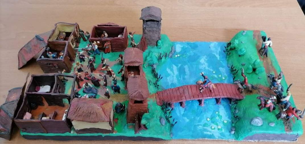 Ну, а как же в творческой коллекции без казаков? Немало их теперь и глиняных. Приятно впечатляют не только одиночные фигурки казаков, но и две композиционные работы, получившие призовые места на творческих конкурсах. Первая — пластилиновая лодка. Ребенок придумал и изготовил казацкую чайку, в которой гребет веслами немалая группа крошечных казаков, во главе с атаманом, а рядом еще и пленный янычар, козак-характерник, который лечит раненого товарища, казак, играющий на барабанах. Вторая интересная пластилиновая работа — казацкое поселение на берегу реки с его жителями, шумная сечевая площадь, казацкие дома, крыши которых можно «открыть», чтобы рассмотреть, какими необходимыми предметами быта они наполнены. Неподалеку — смотровая башня и мостик, который с противоположного берега на лошадях вот-вот пересекут семь воинственных всадников…