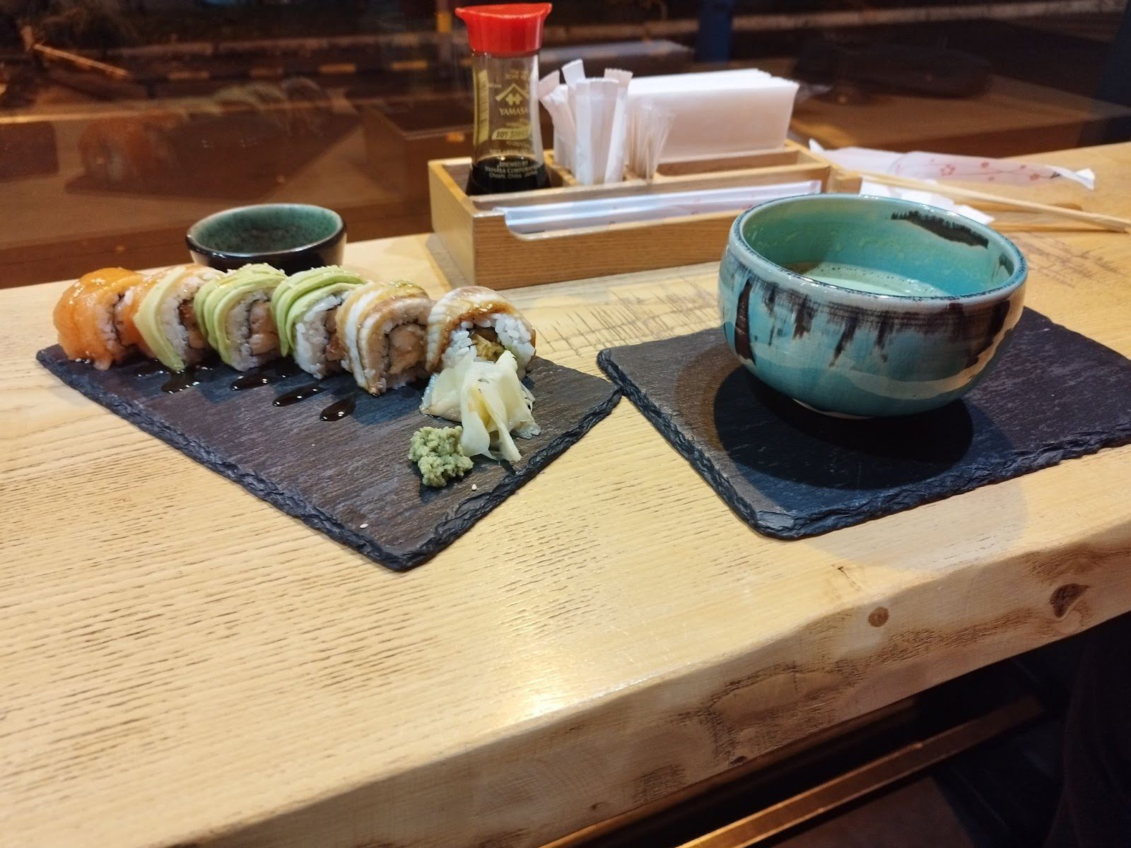 Также здесь готовят гьодзу (японские жареные пельмени с хрустящей корочкой), булочки бао с креветками, а для любителей спиртных напитков здесь есть вкусный цитрусовый глинтвейн. К сладкому столу подают брауни с мороженым, моти с разными вкусами, чизкейк с зеленым чаем, капучино, чай матча и еще много разных суши и не только.