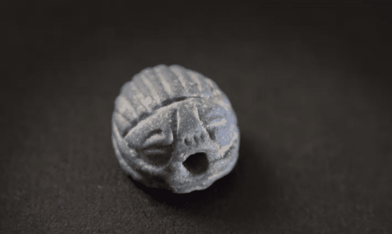 Тоді дослідникам трапилося парне дитяче поховання сарматського періоду, де зокрема були виявлені два намиста. Але найбільш вразила підвіска у формі жука-скарабея. Жук-підвіска з темно-синього єгипетського фаянсу (який був фрагментом намиста зі скляними прожилками) за пару тисяч років “очікування” археологів у землі, виглядав доволі досконало. Фахівці припускали, що він взагалі майже не змінив свого первинного вигляду. Це показово, щоб зрозуміти високий рівень тогочасних майстрів. Описуючи знахідку, археологи наголошували, що то досить містичний символ у багатьох народів, зокрема в давньому Єгипті (там він був уособленням відродження життя і символізував бога сонця Хепрі). Прикрасу одягали на себе живі, а ще її клали в домовини (насамперед у поховання дітей та жінок), вірячи, що вона супроводжуватиме покійника і сприятиме його відродженню в іншому світі. Жук-скарабей став першою такого типу знахідкою на Полтавщині (принаймні офіційно). Вона датована другою третиною І — серединою ІІ століття нашої ери.